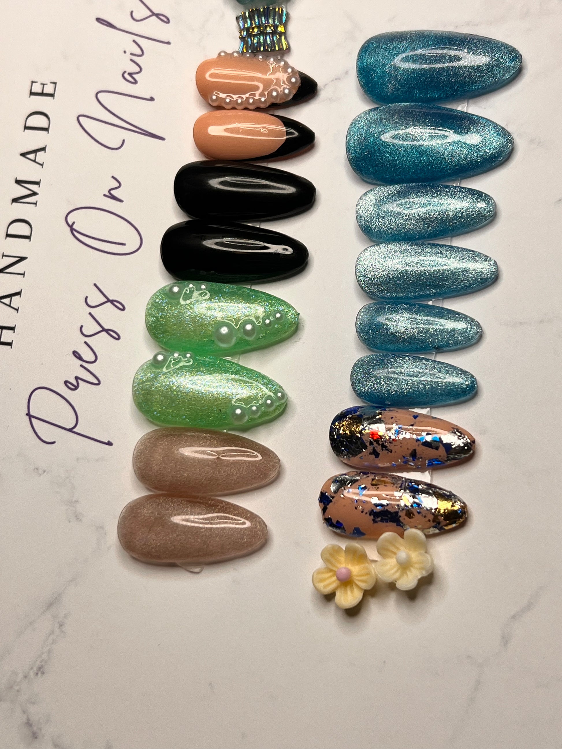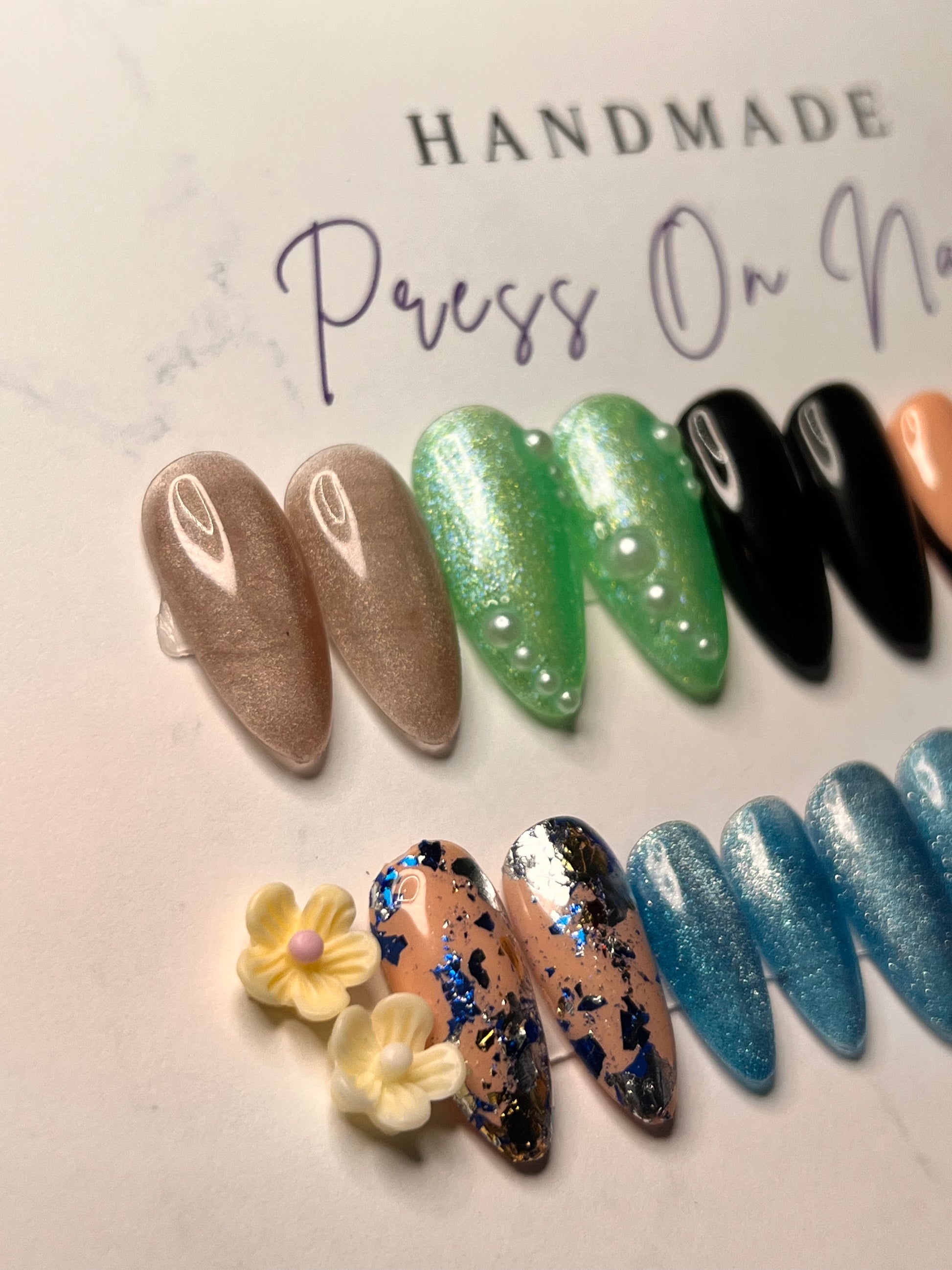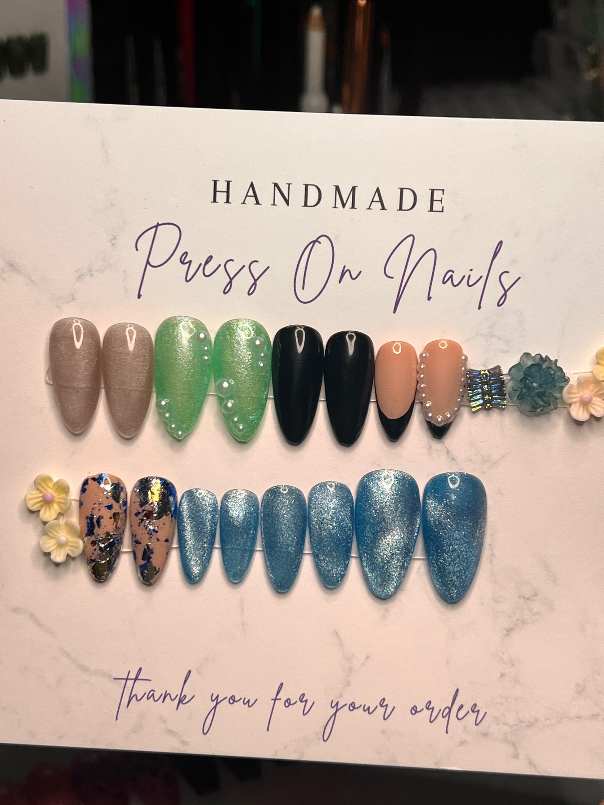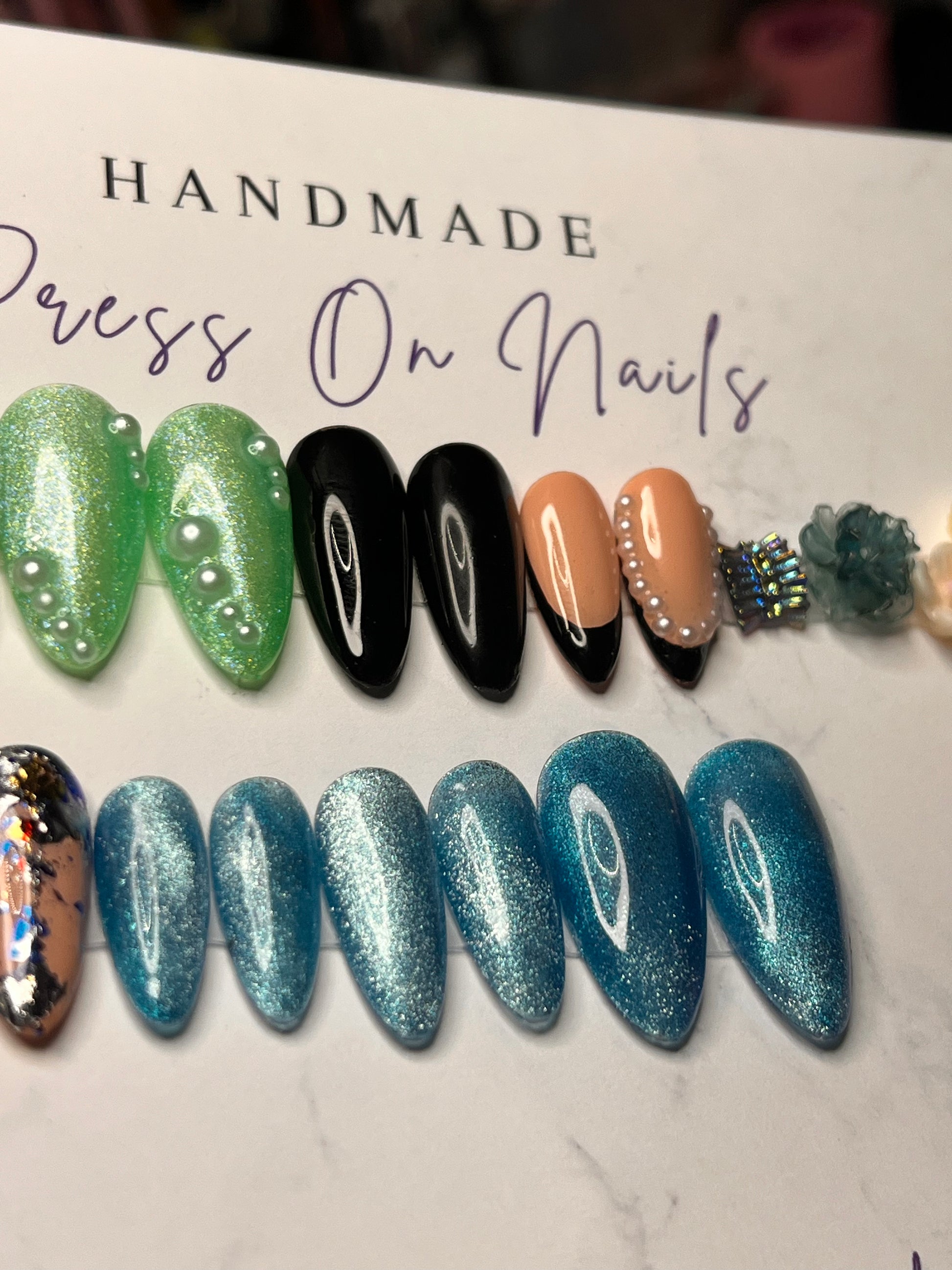 - 14 handmade press-on nails (includes two size 5 nails, one with cat eye effect)
