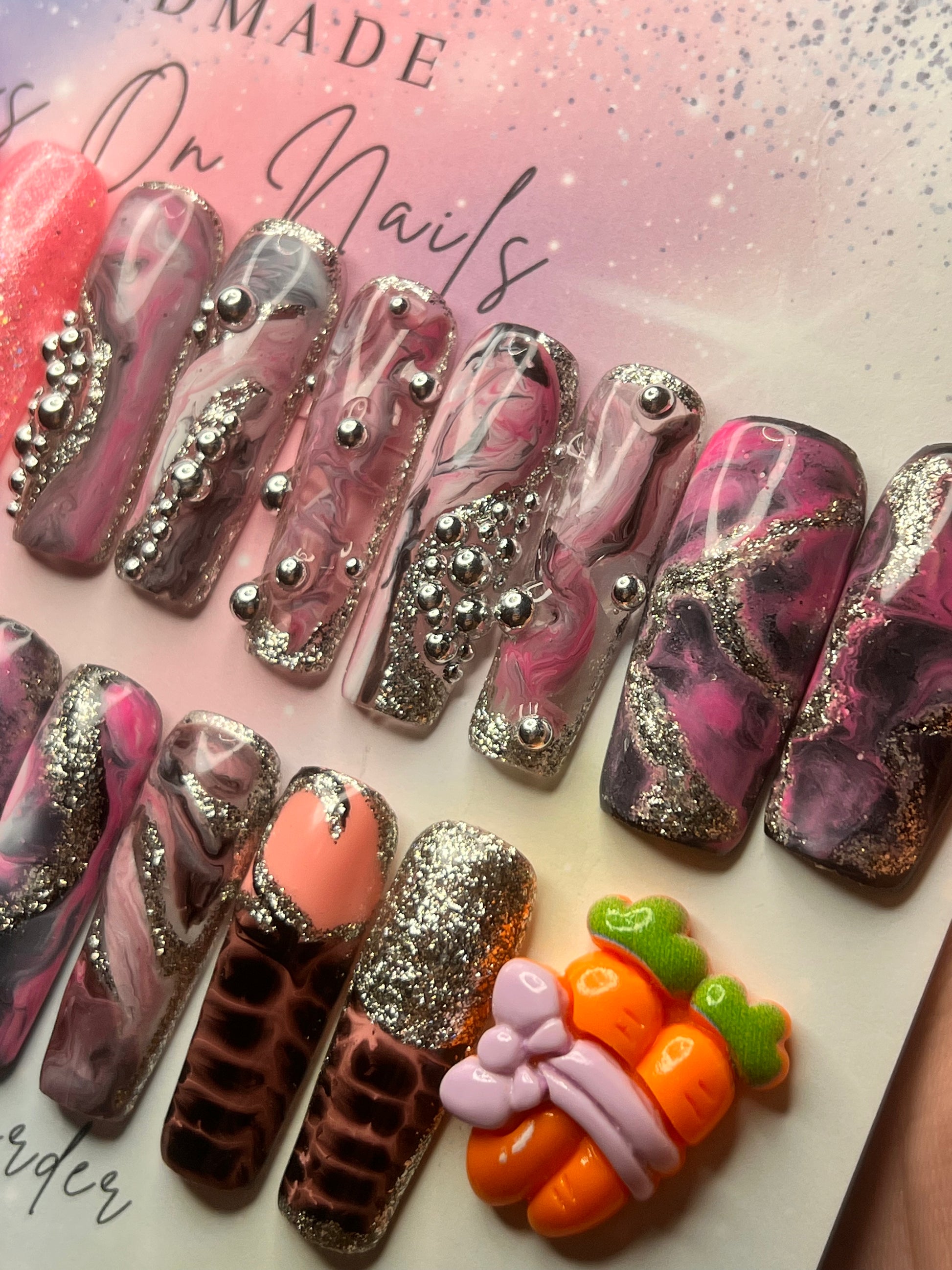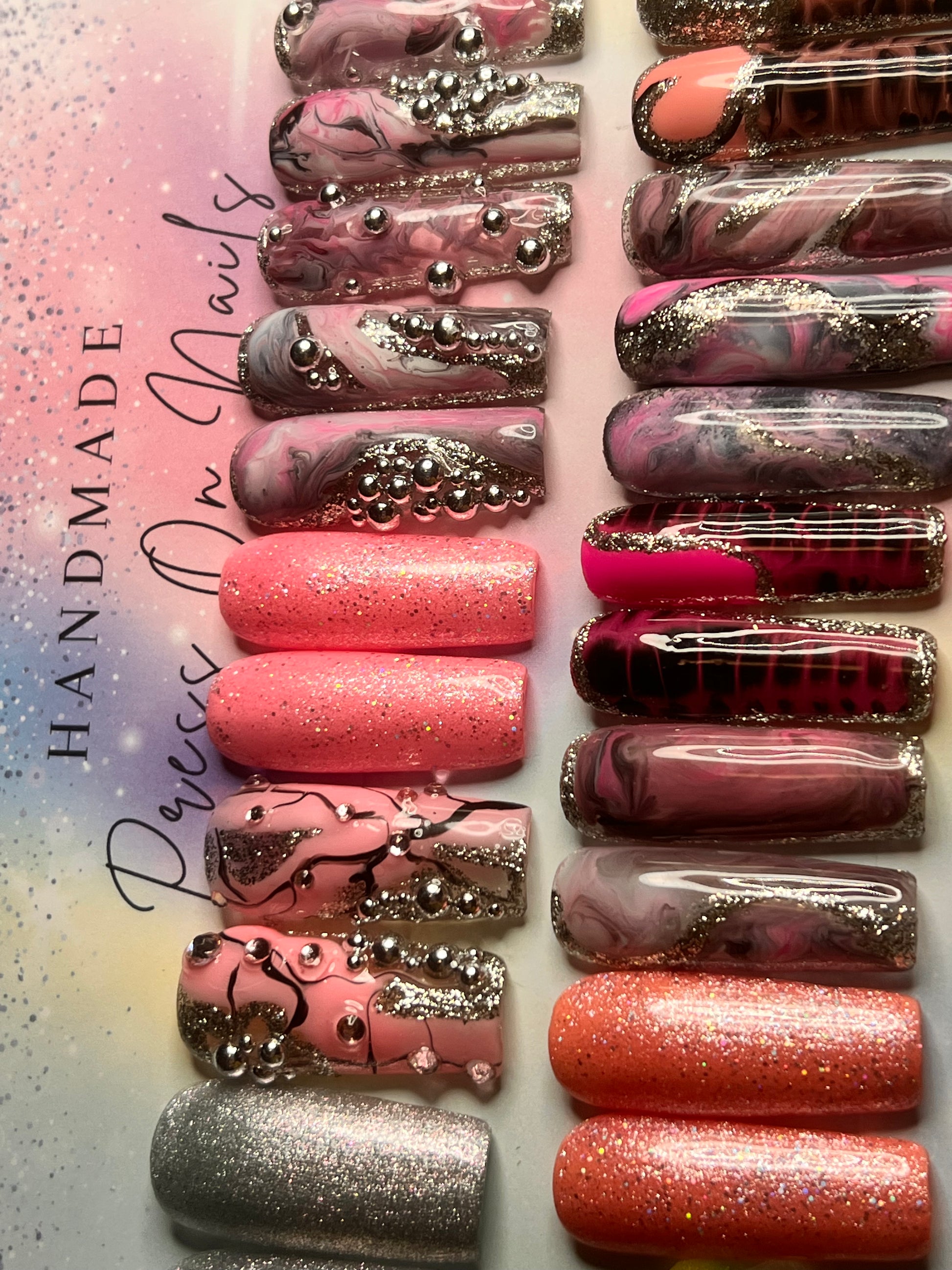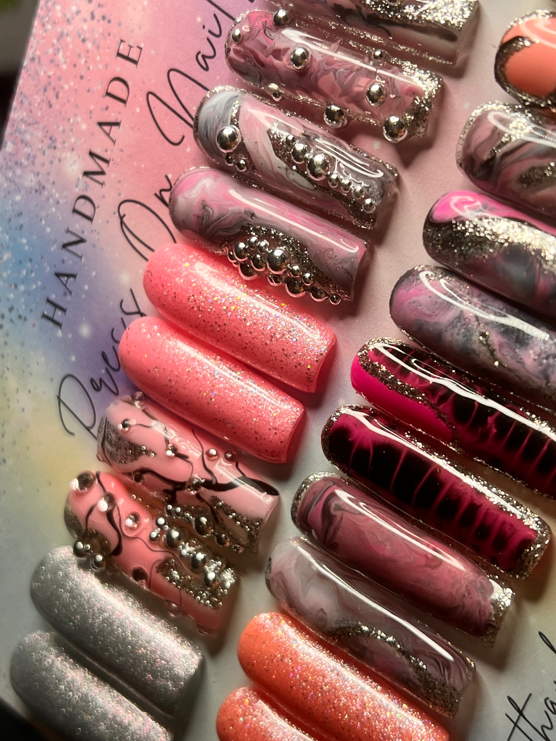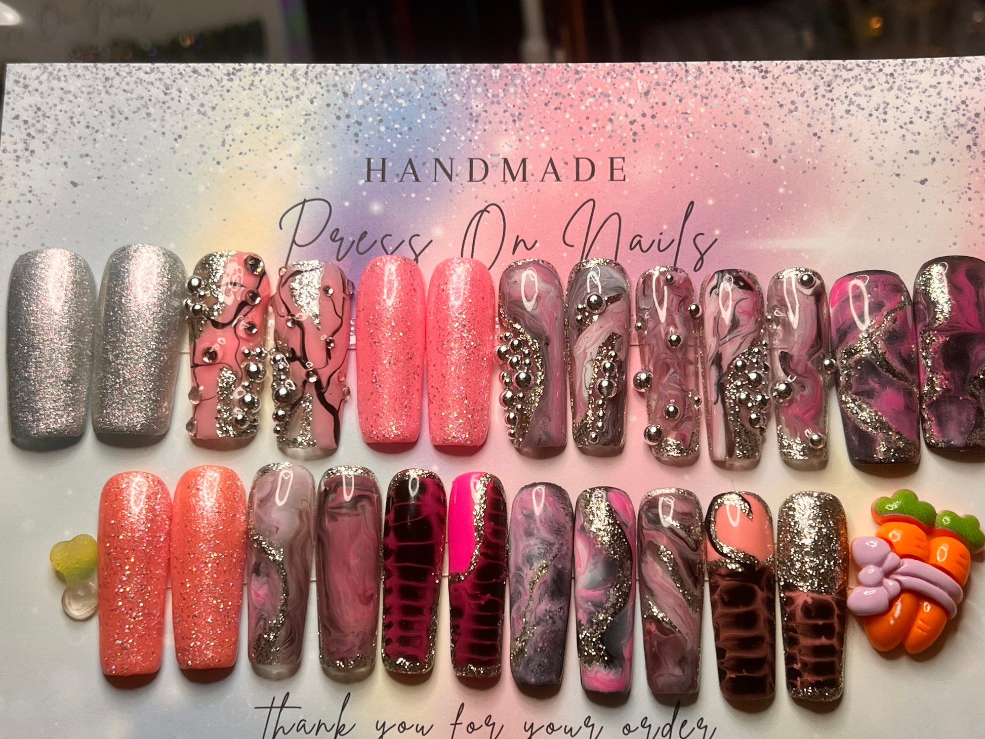 - 16 handmade press-on nails (2 of each size — includes an extra pair of size 4)