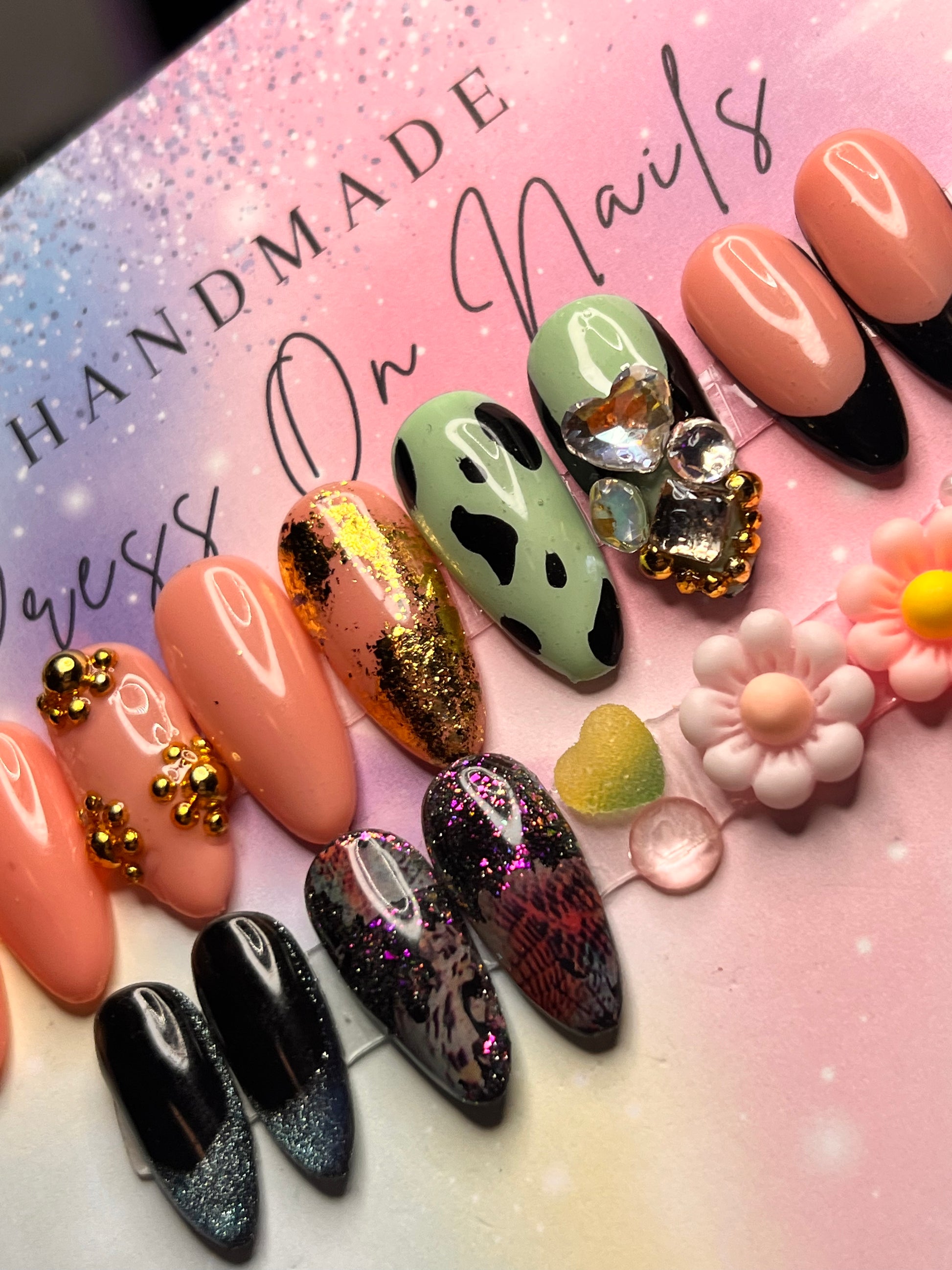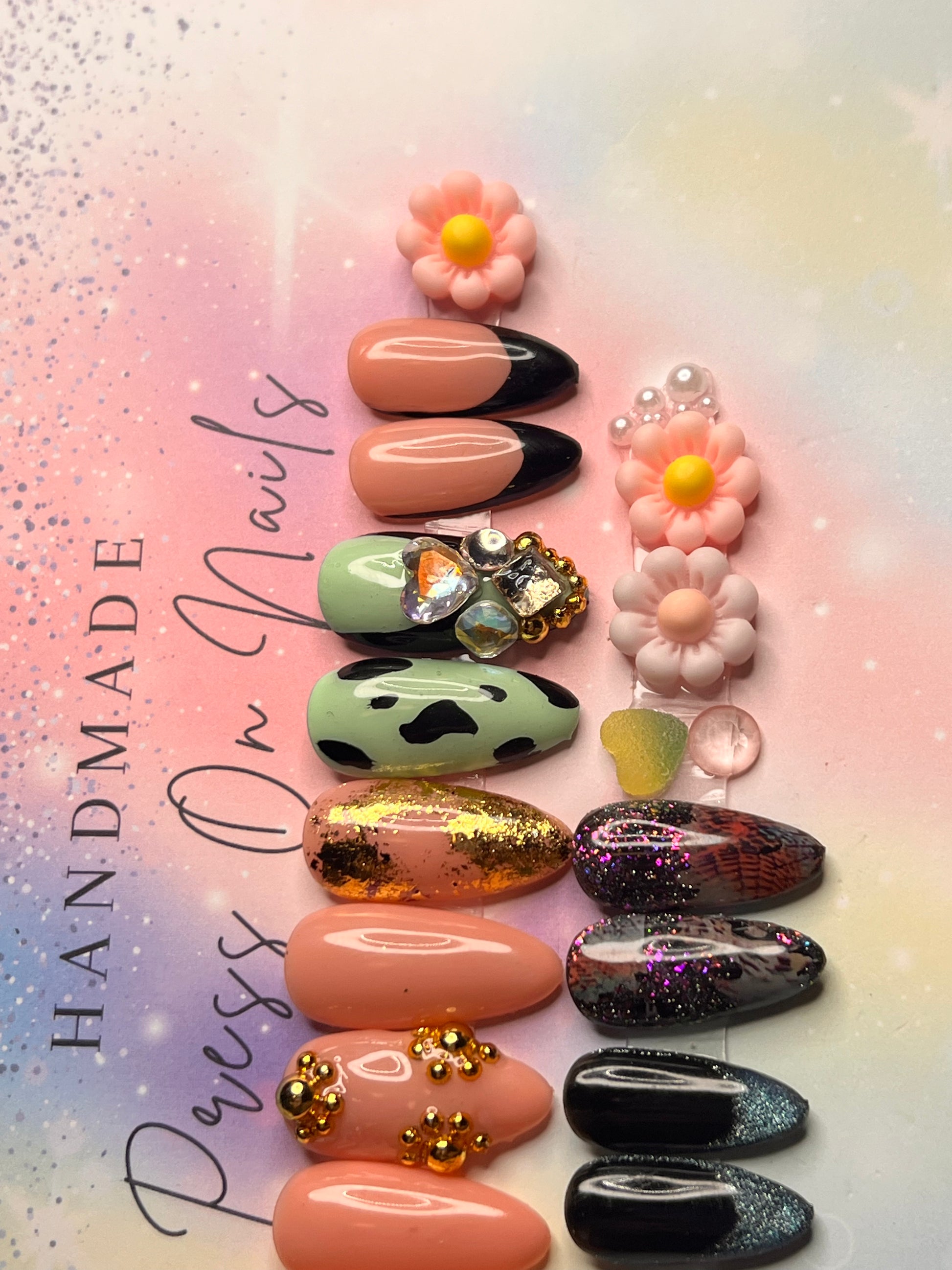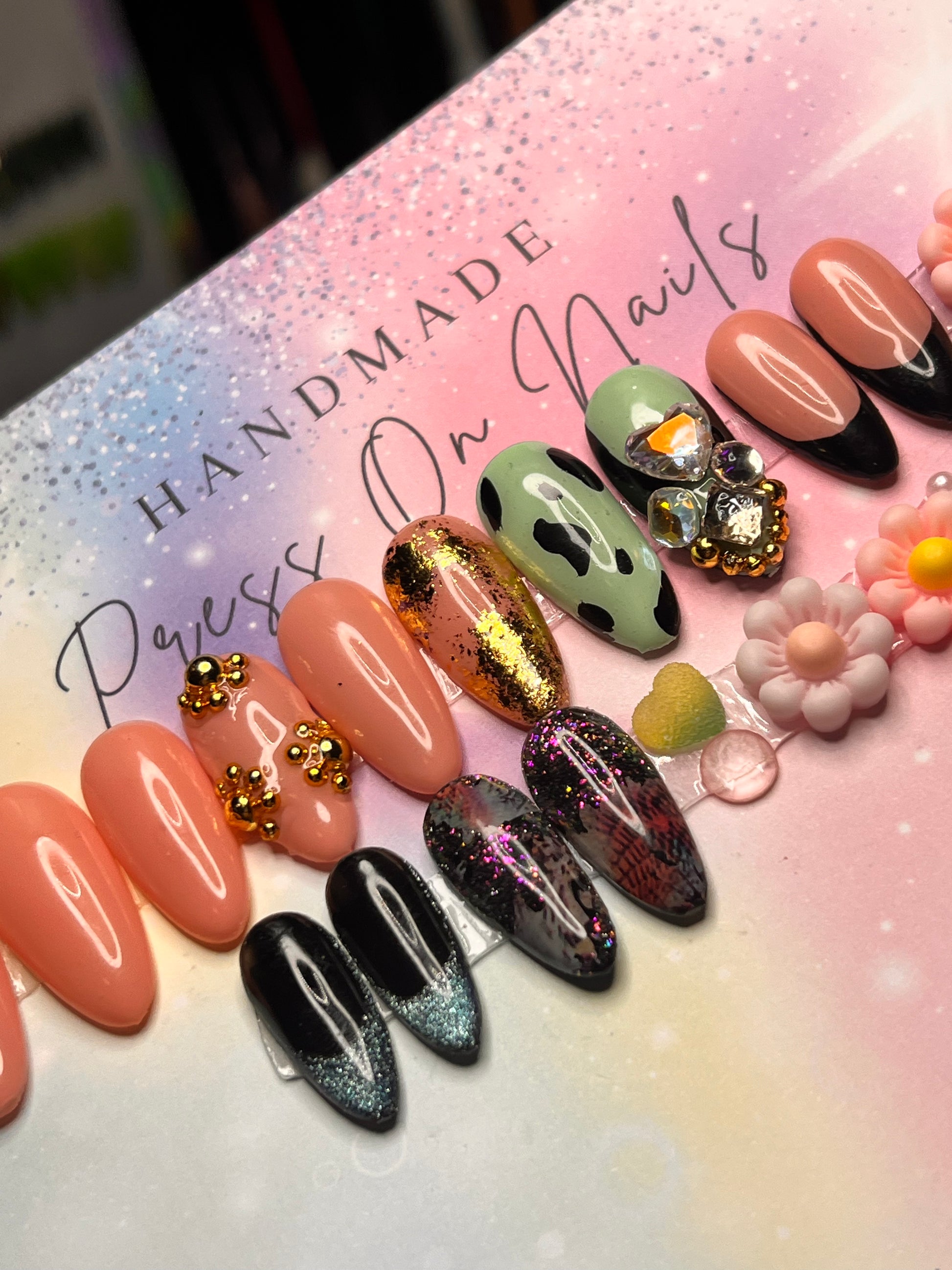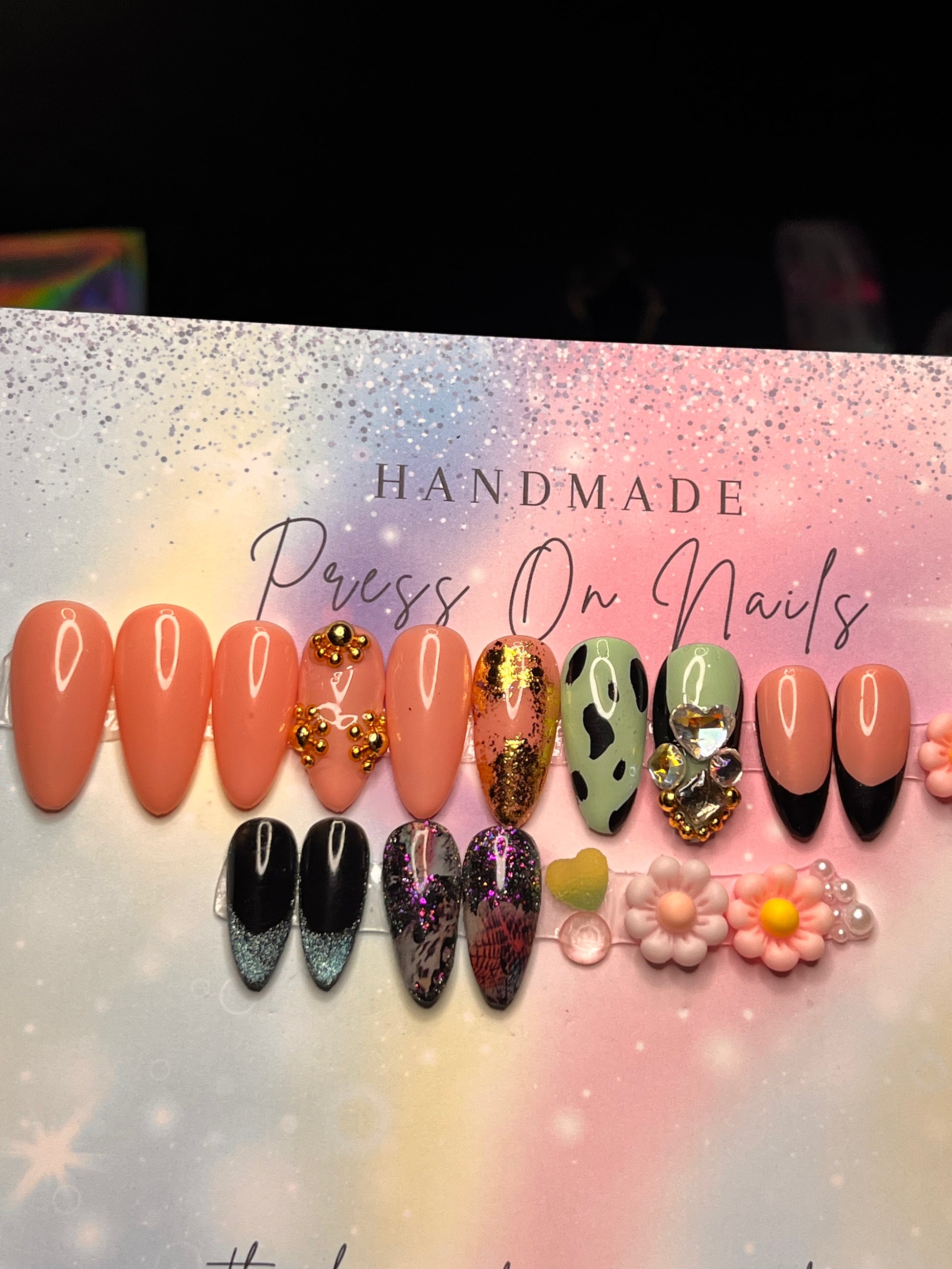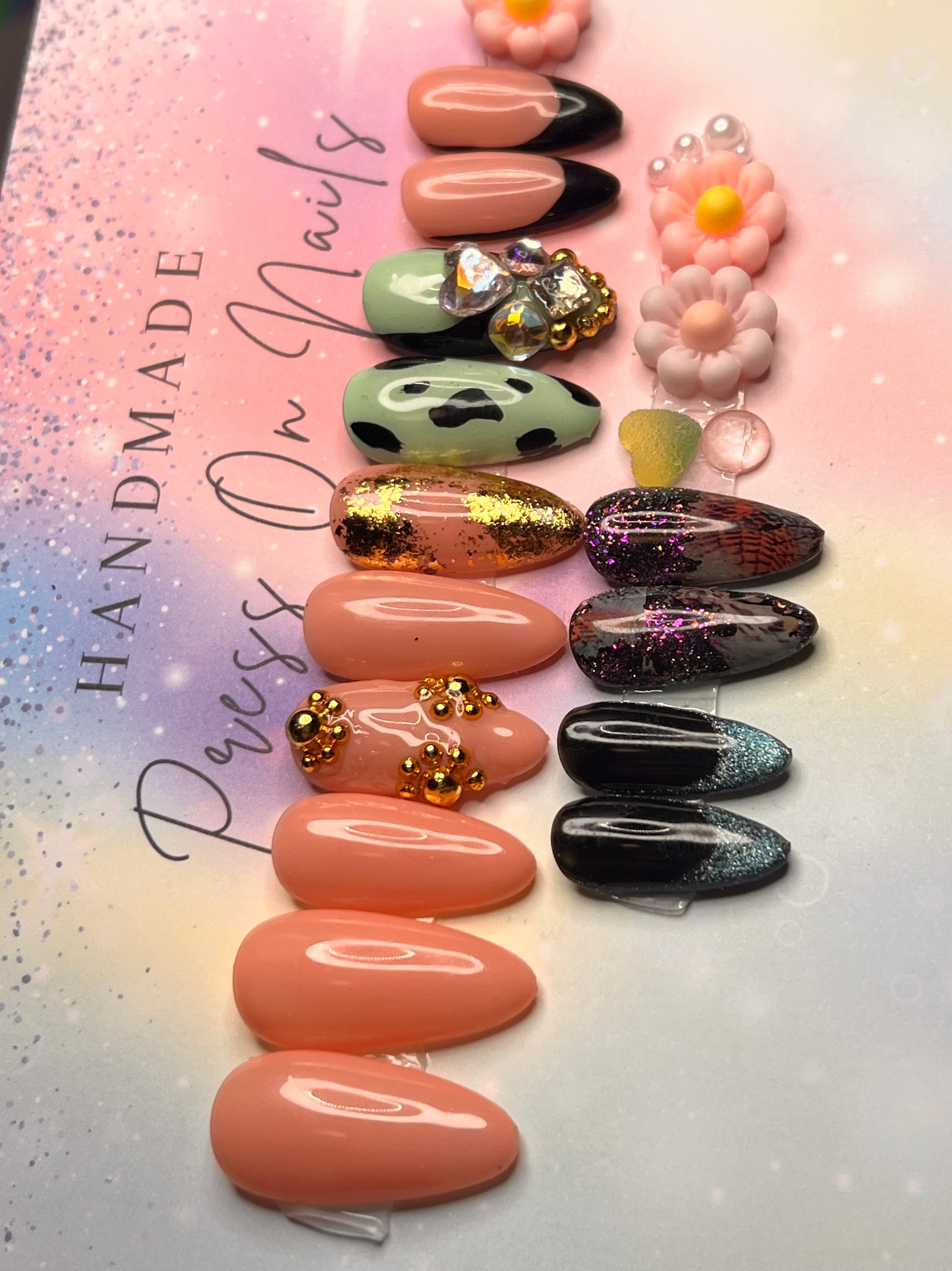 - 12 handmade press-on nails (2 of each size for both hands)