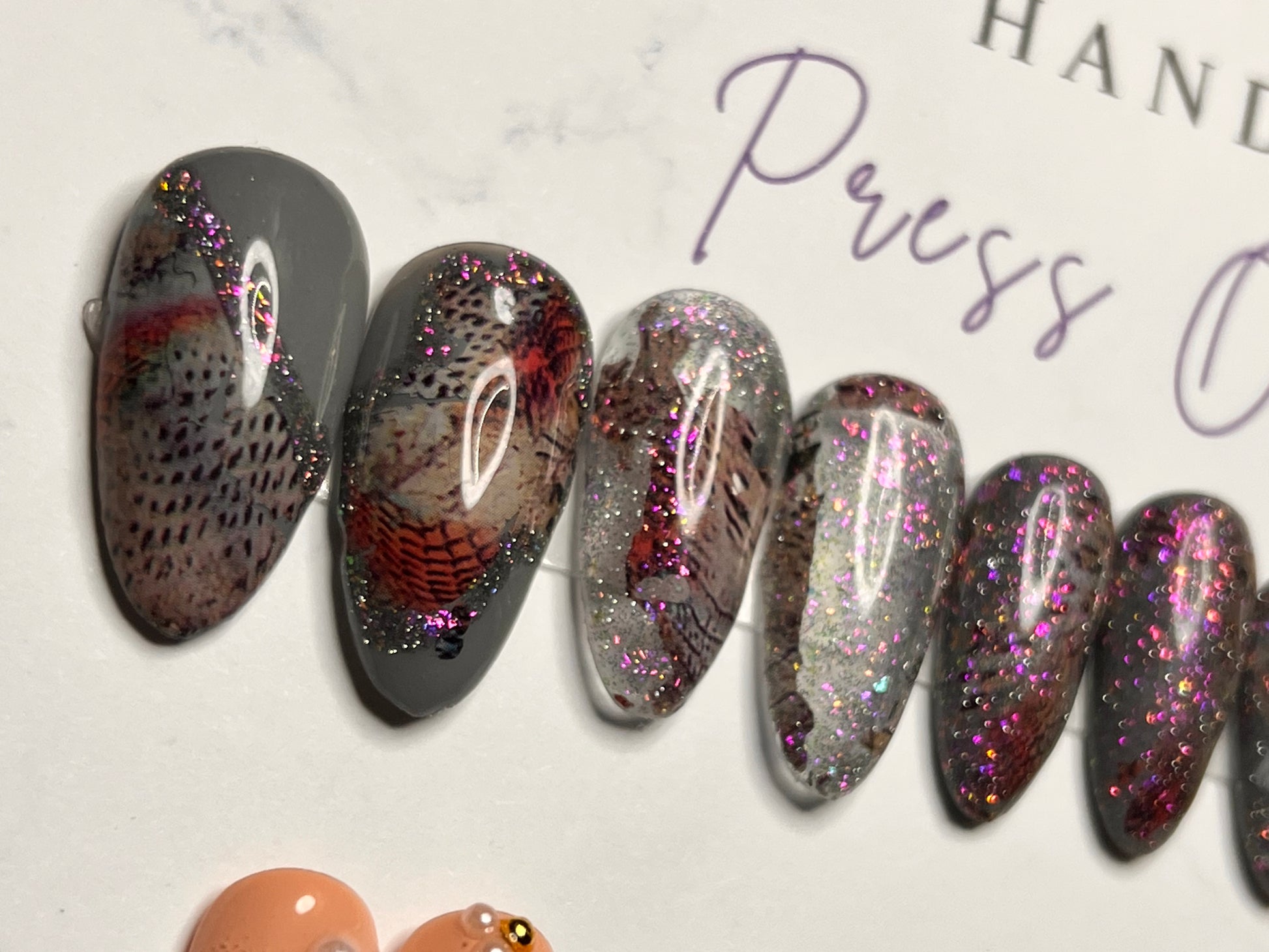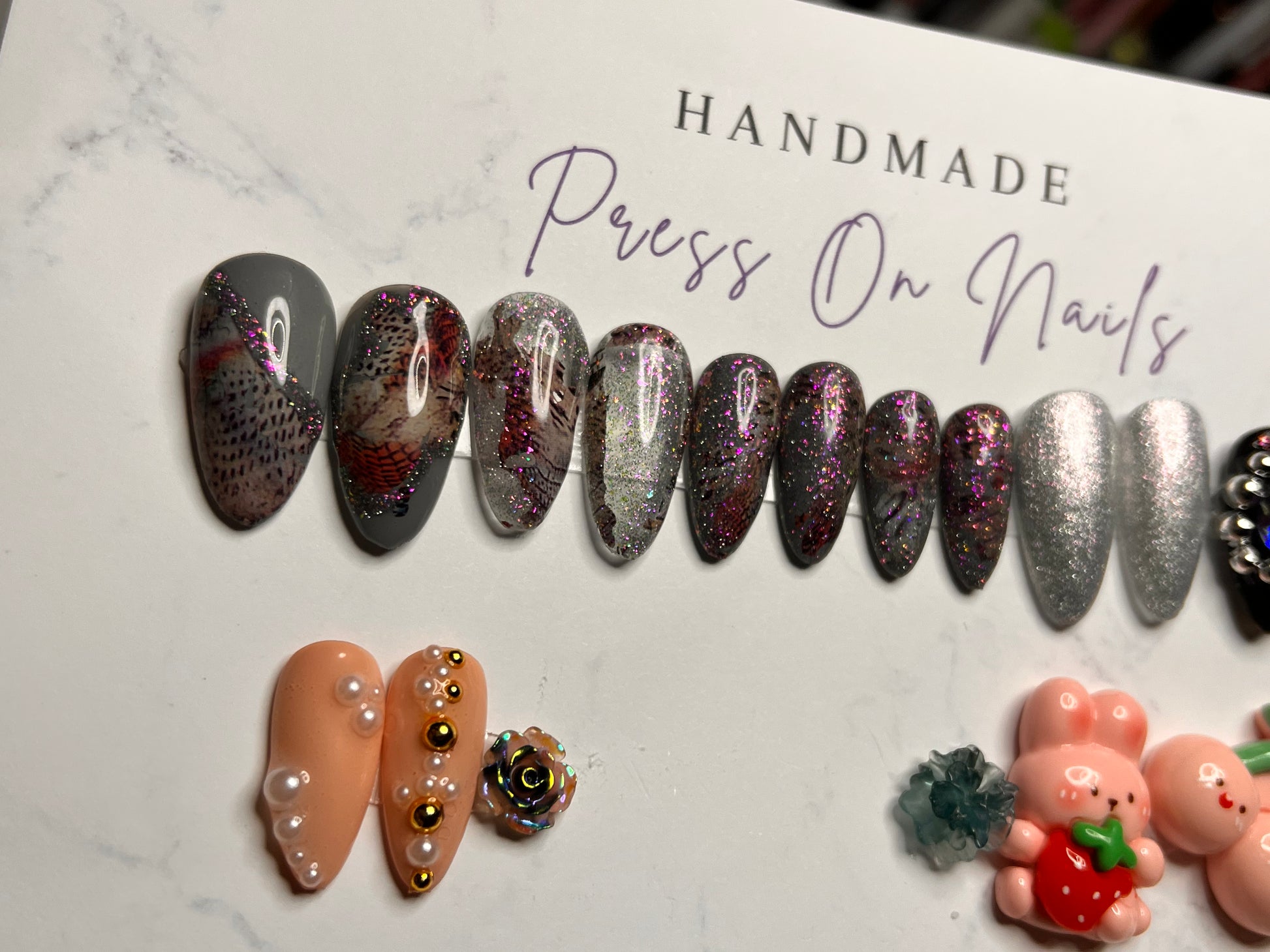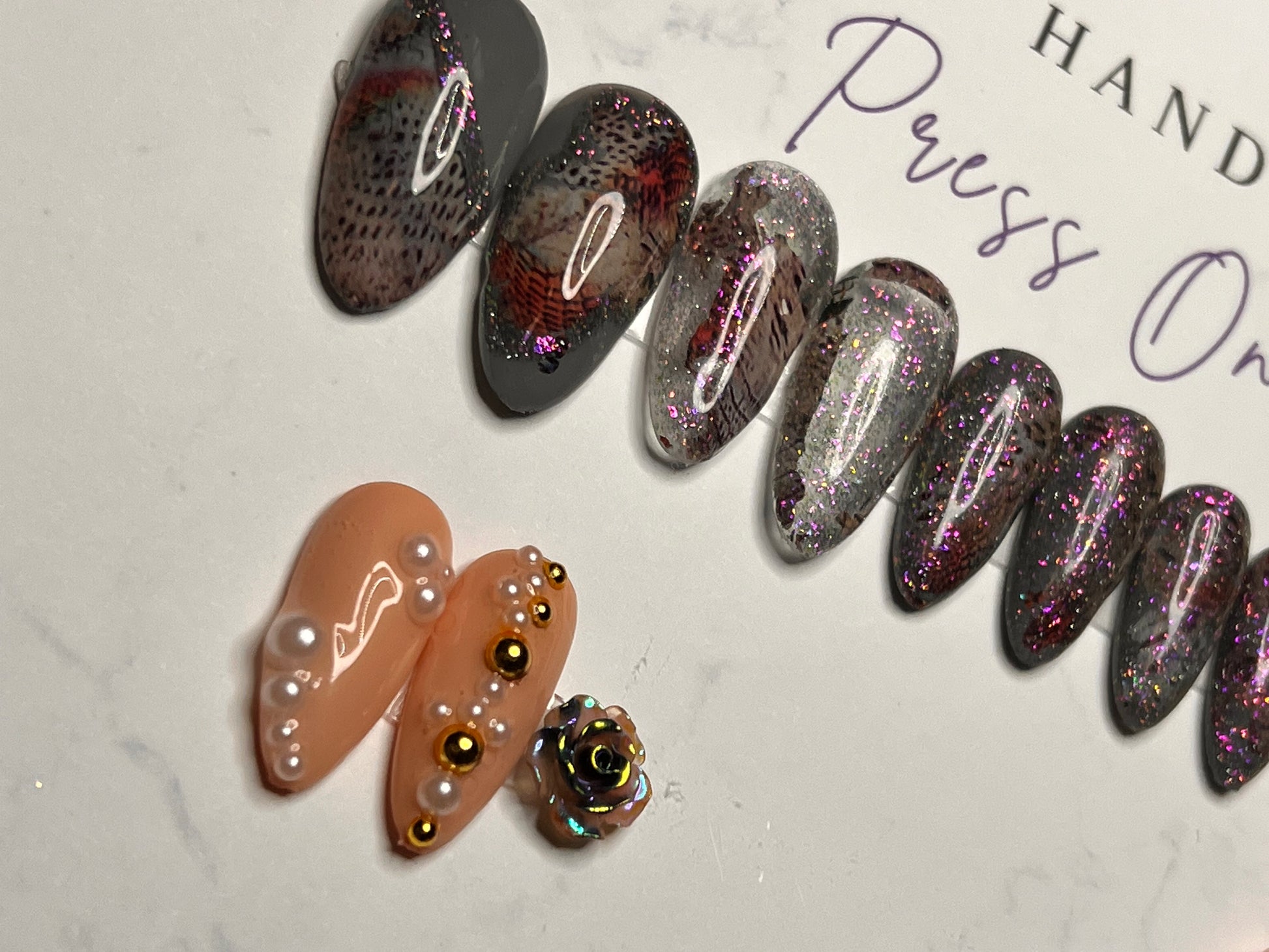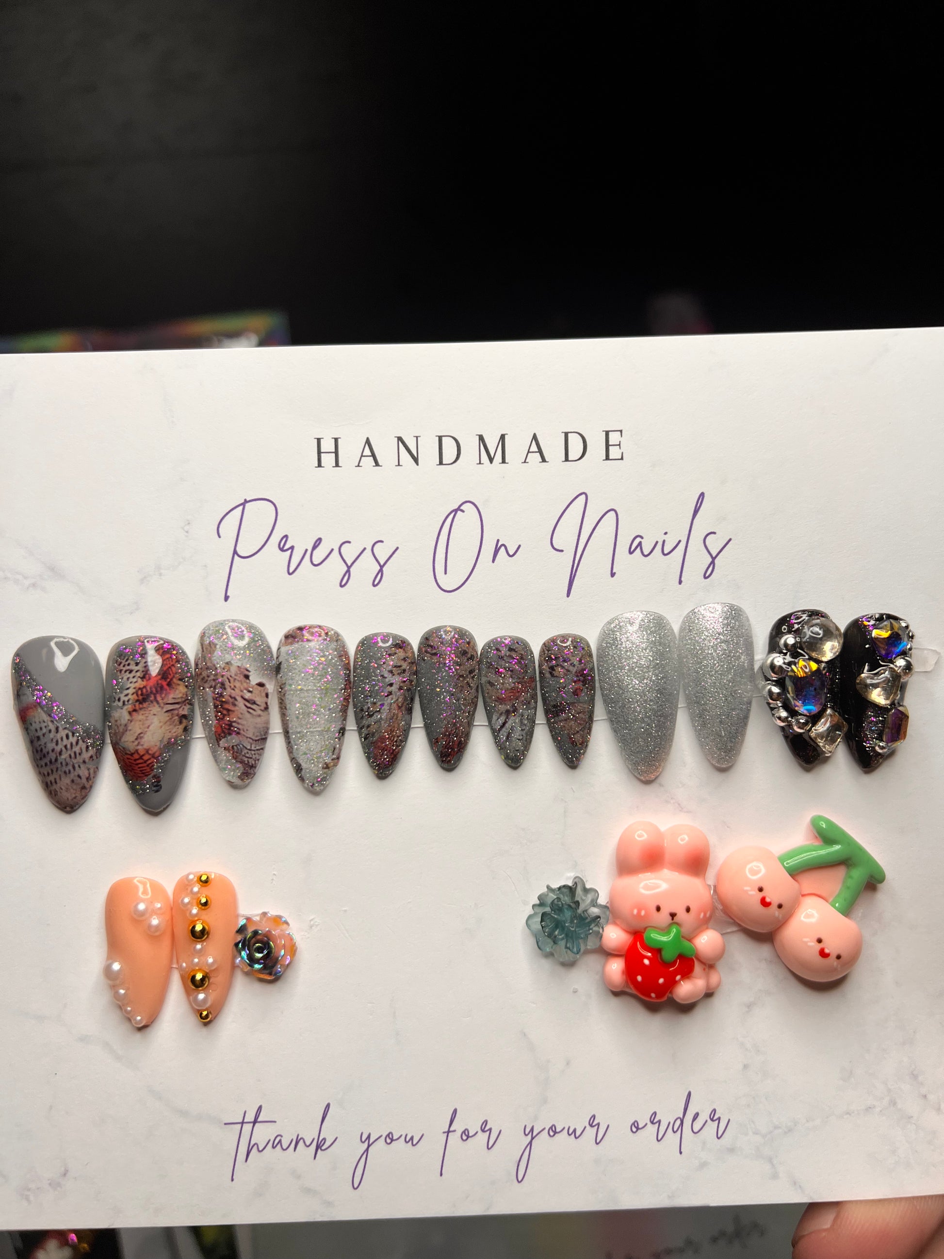 - 12 handmade press-on nails (2 of each size for both hands)
