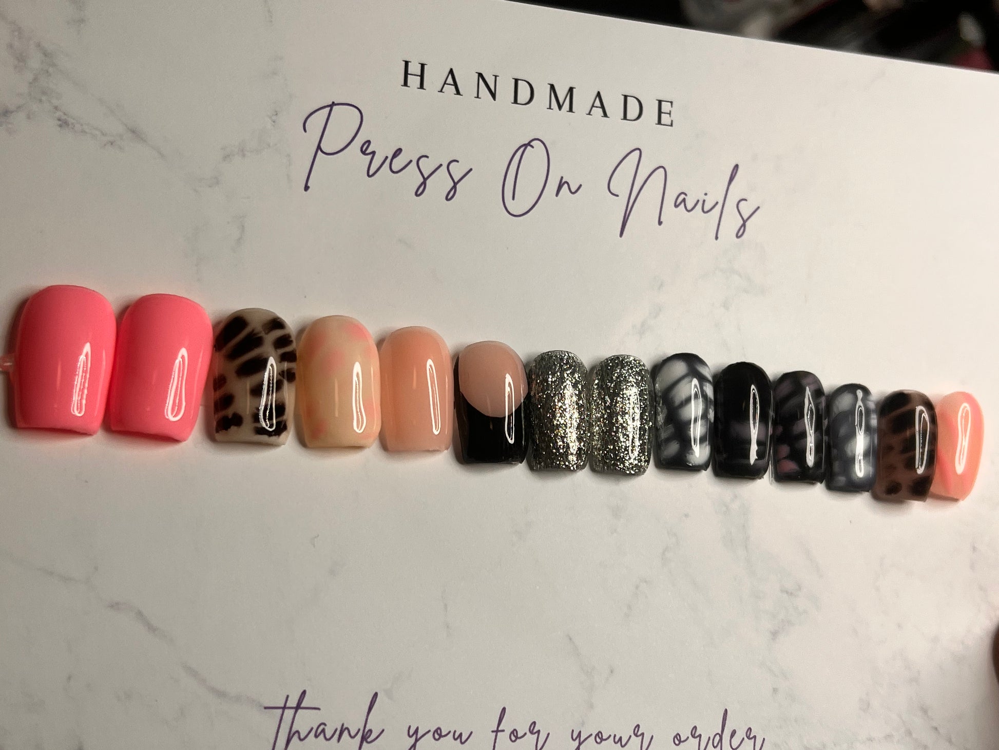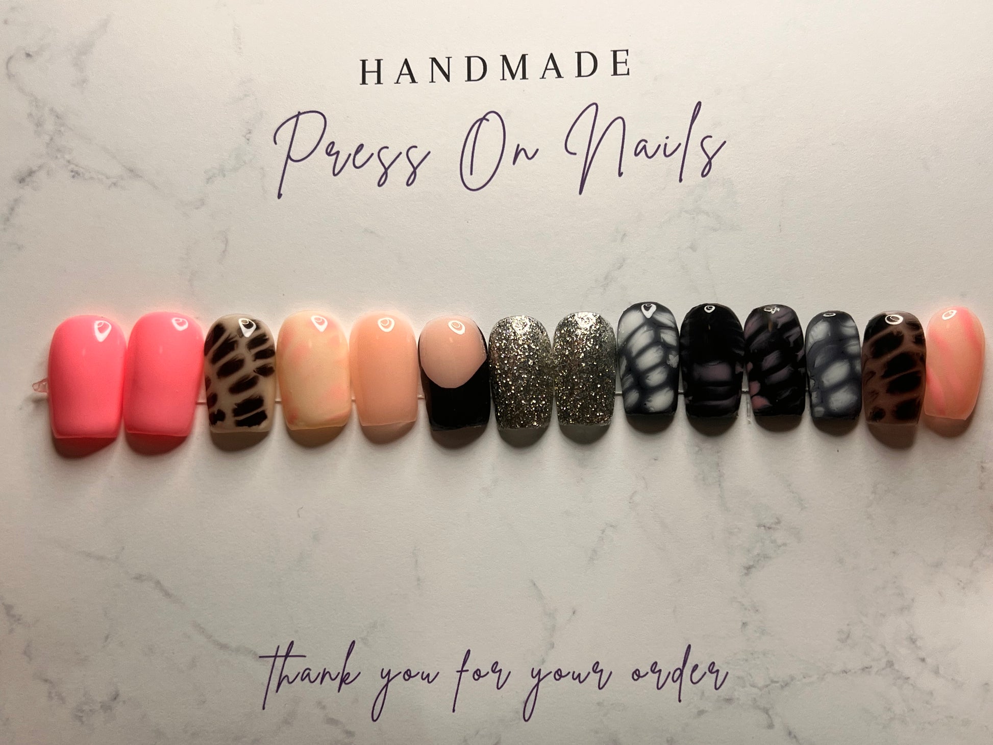 - 14 handmade press-on nails (2 of each size for both hands)