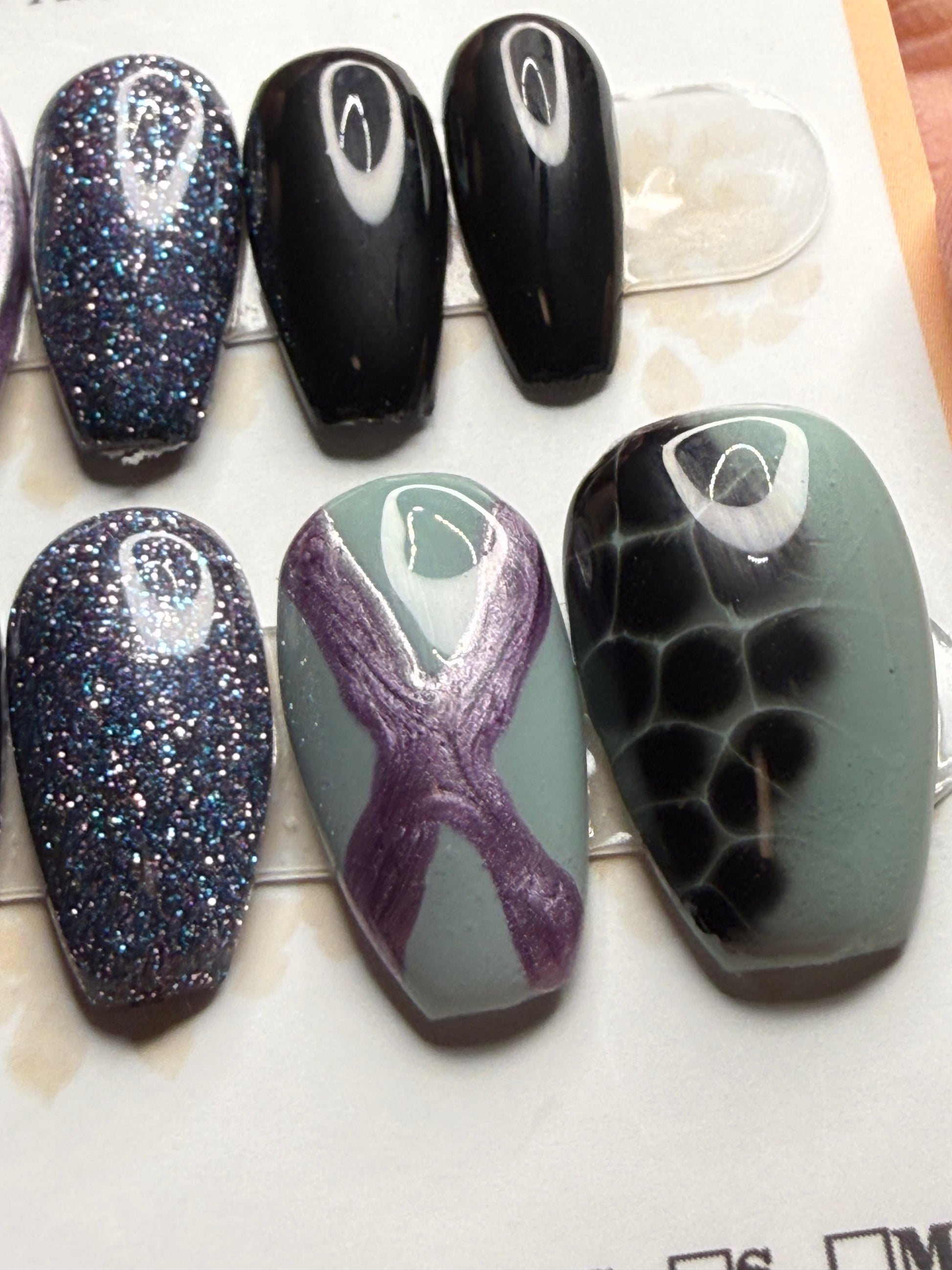 - 10 handmade press-on nails (2 of each size from 1, 4, 6, 7, 8)