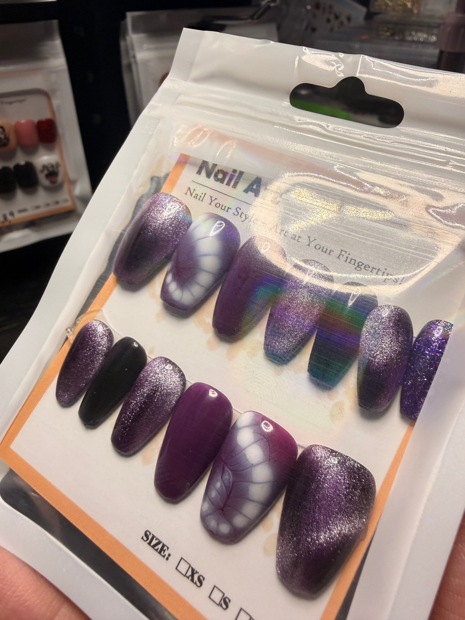 - 14 handmade press-on nails (2 of each size from 1, 2, 4, 5, 7, 8, 9)