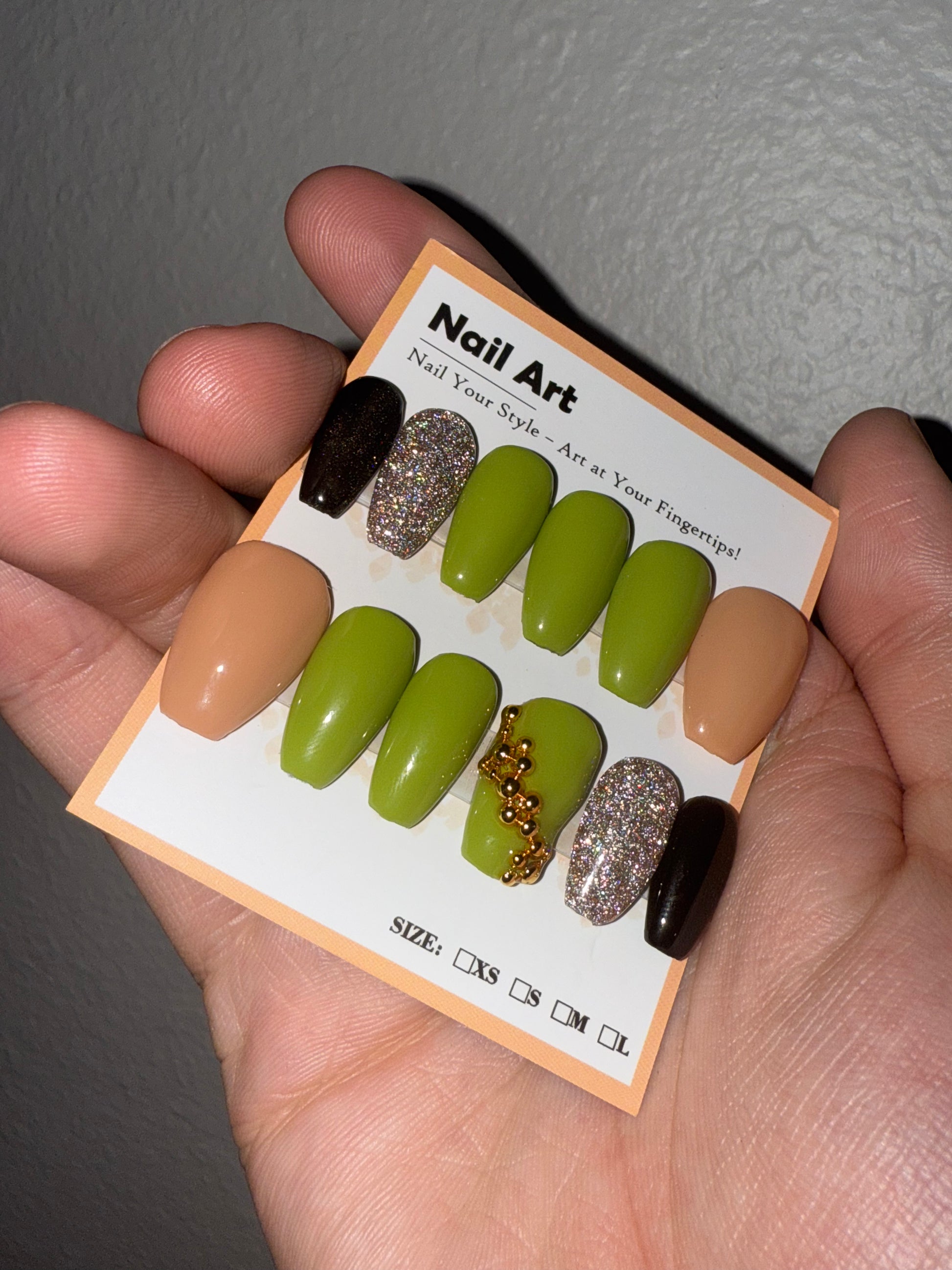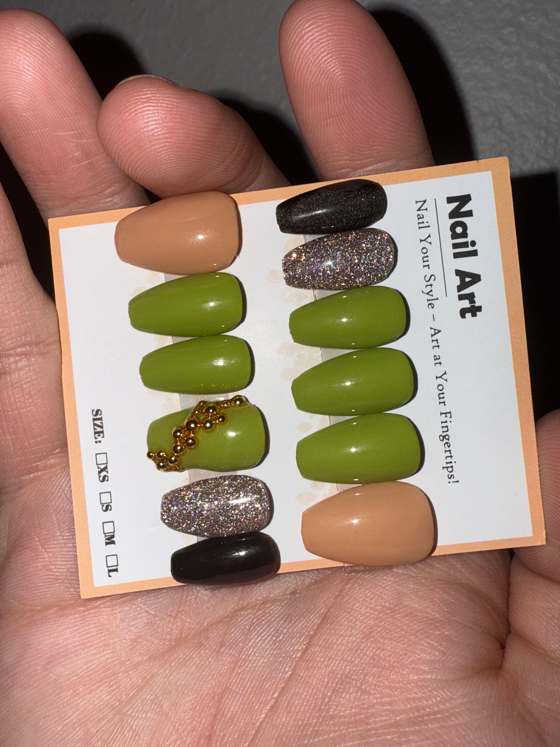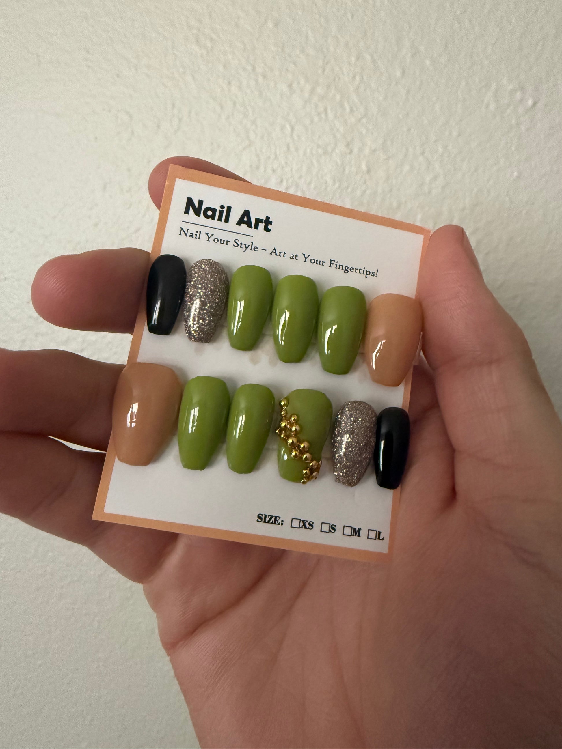 - 14 handmade press-on nails (2 of each size for both hands), including 1 special color accent nail with color-changing and glow-in-the-dark effects