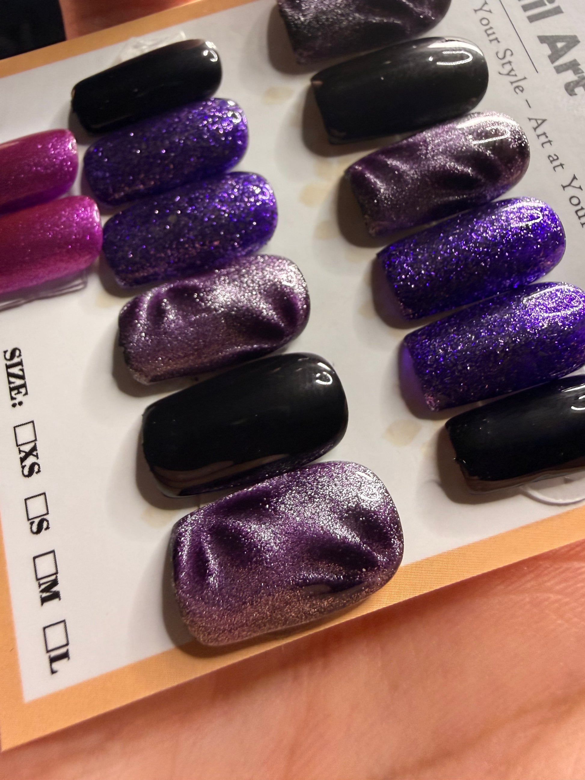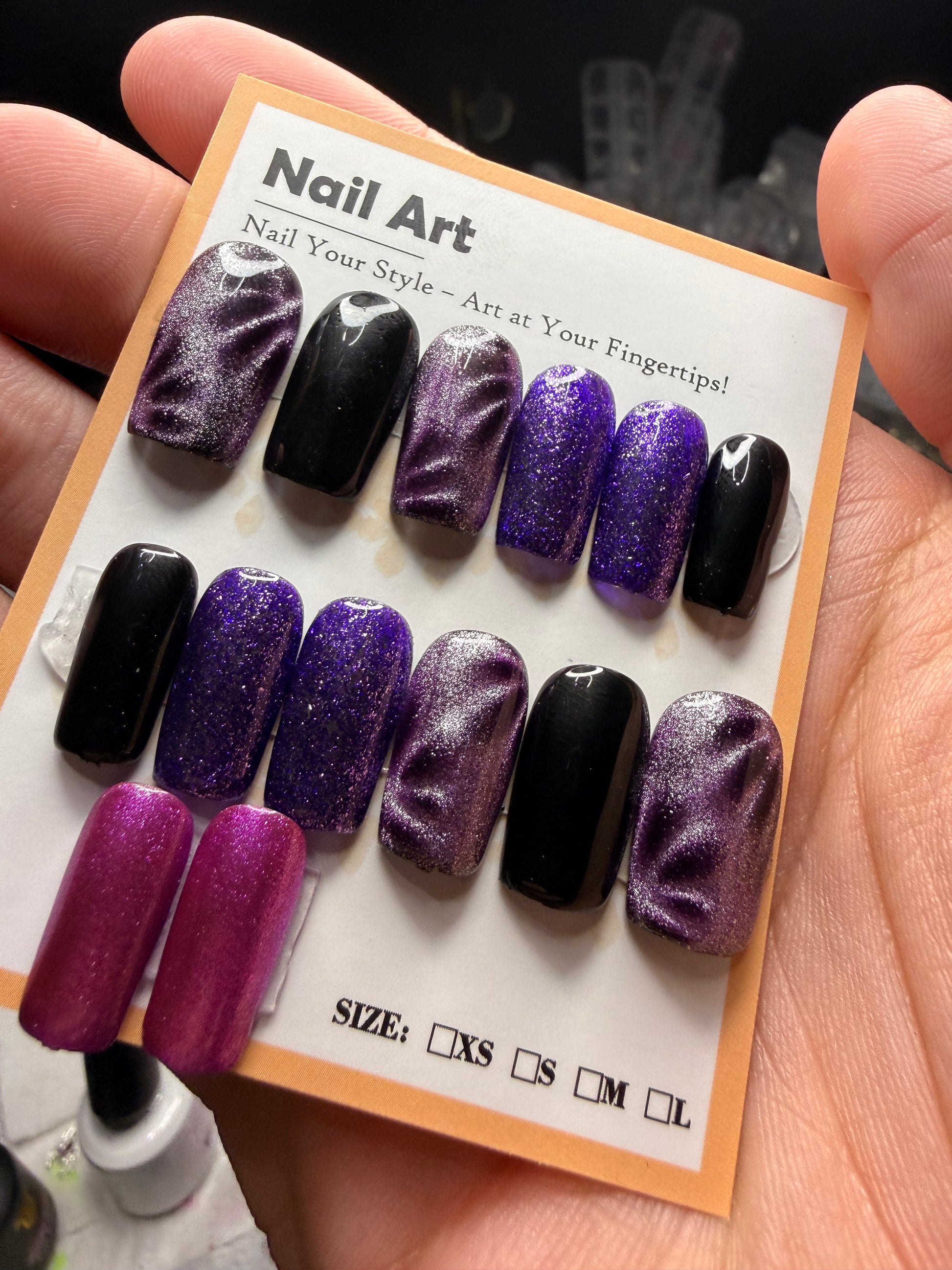 - 14 handmade press-on nails (2 of each size from 2, 4, 5, 6, 7, 8, 9)