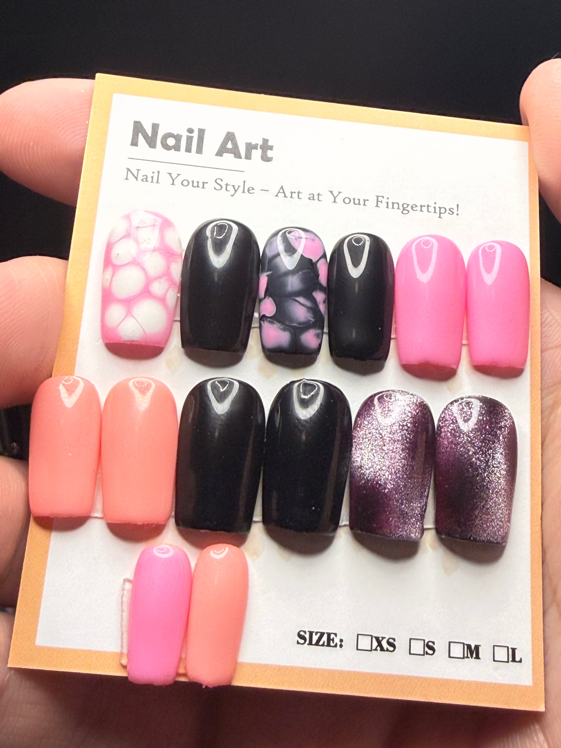 - 12 handmade press-on nails (2 of each size from 2, 3, 4, 5, 7, 10)