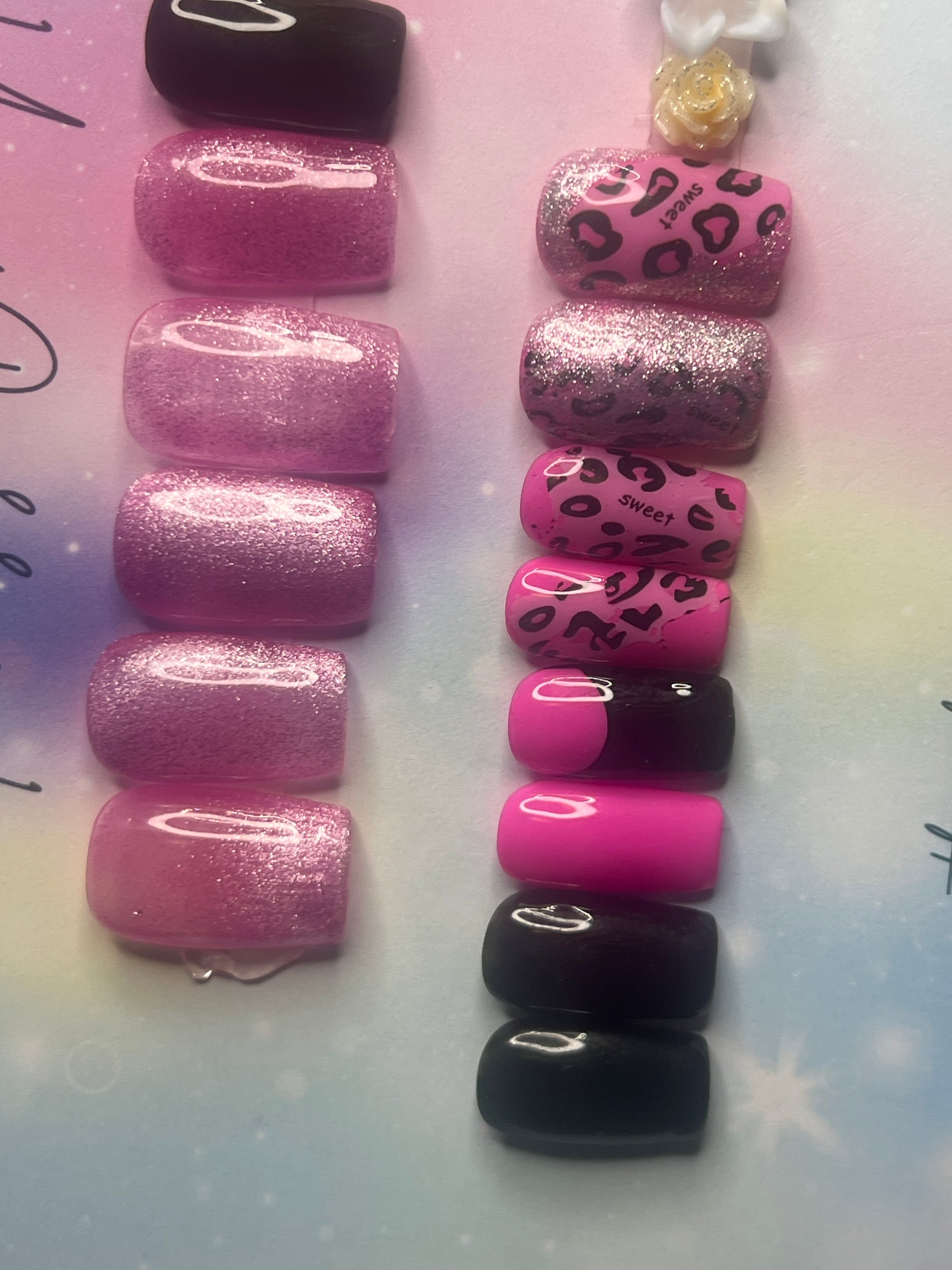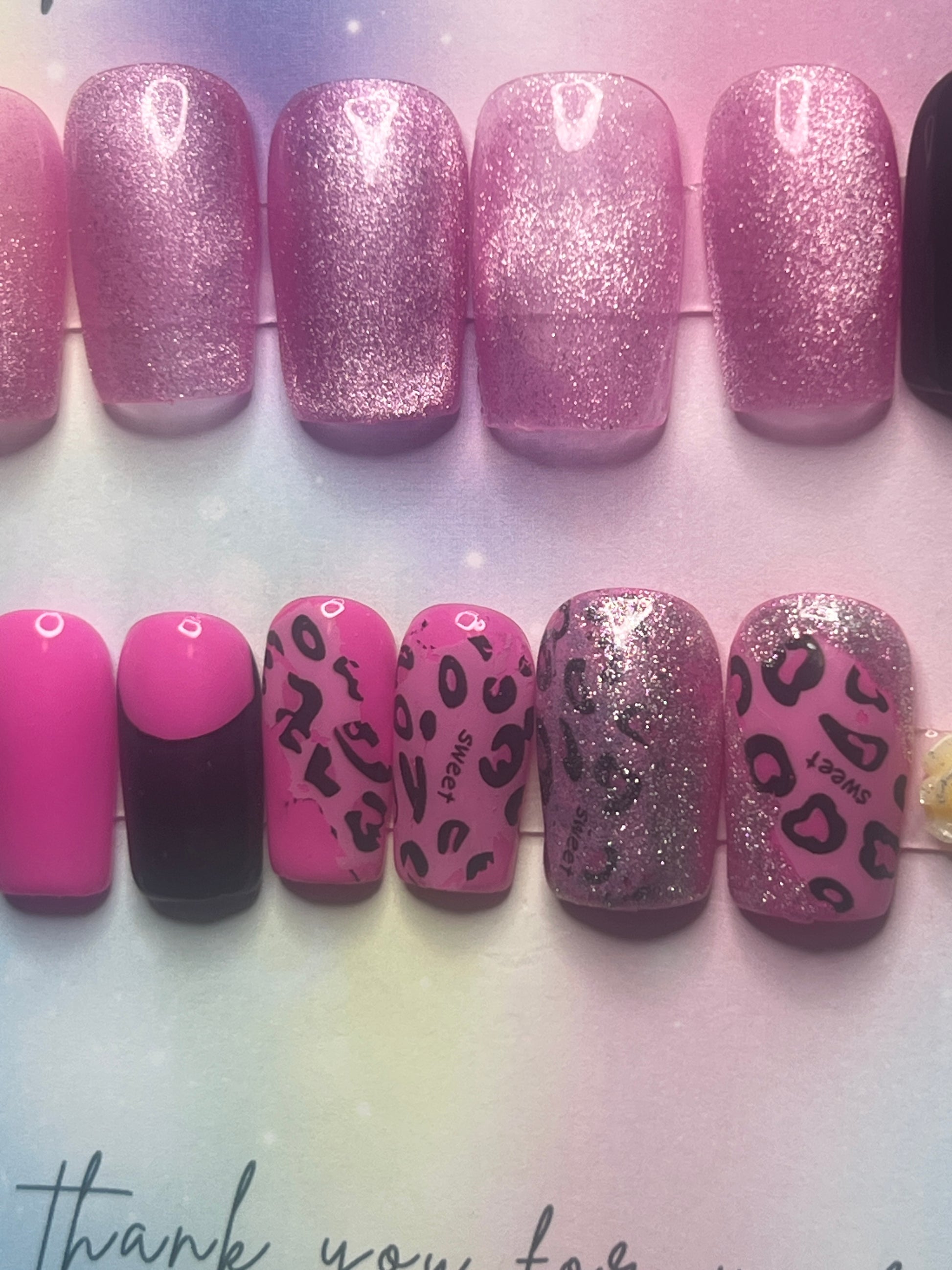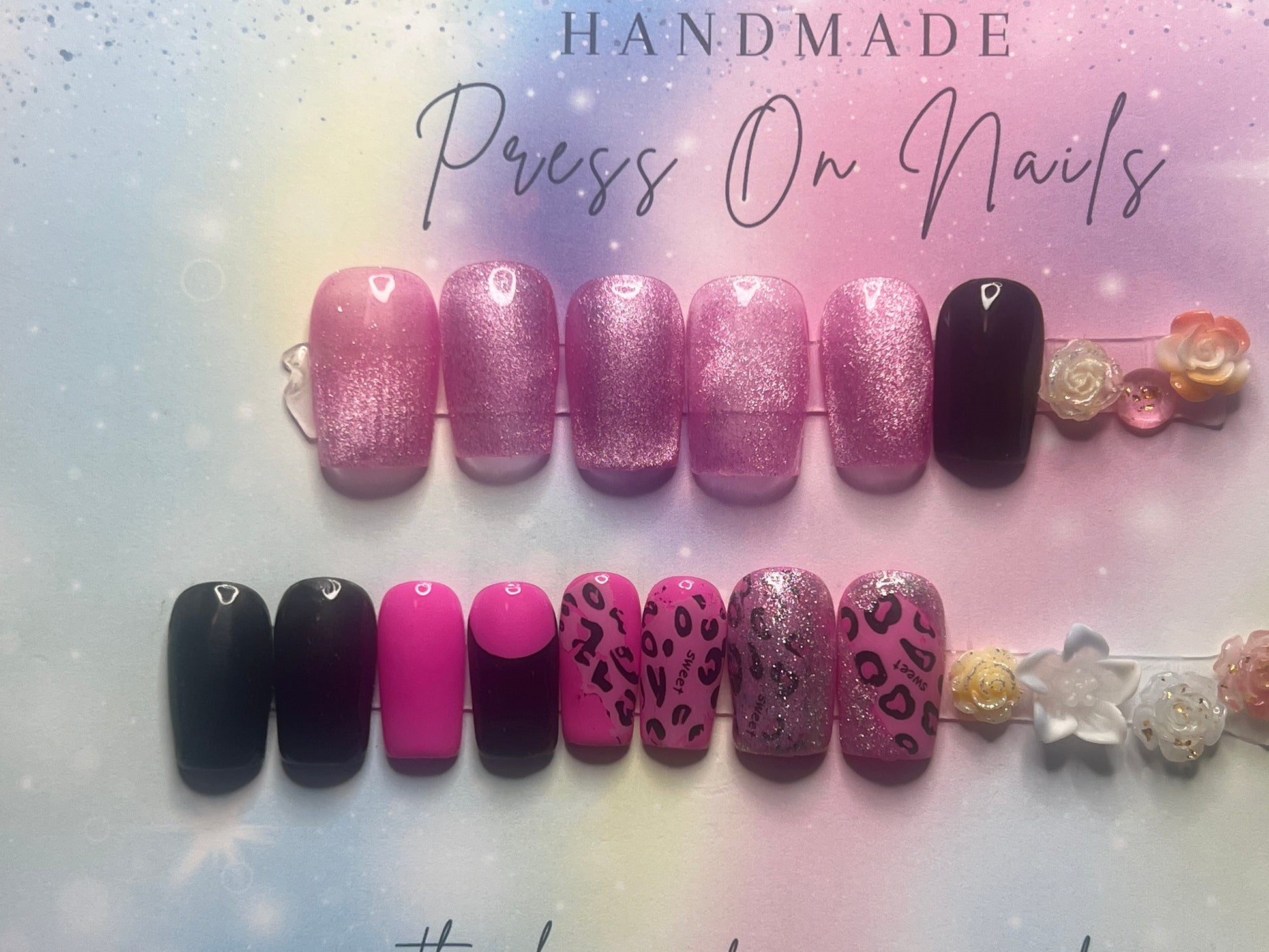 - 14 handmade press-on nails (2 of each size for both hands)